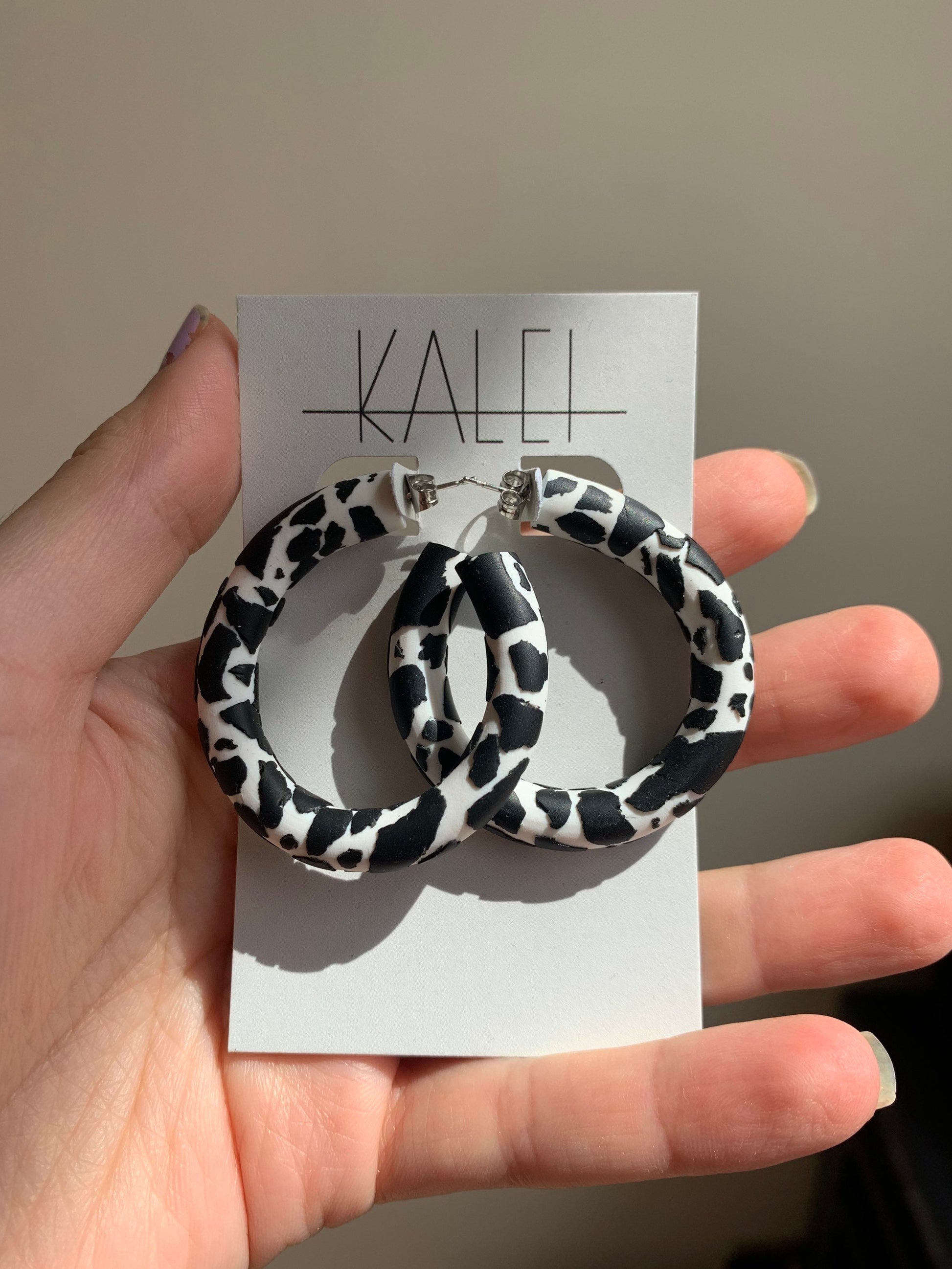 Add a playful touch to any outfit with monochromatic cow print hoops! Handcrafted from lightweight polymer clay, each pair features a unique black-and-white cow print pattern that is individually cut, so no two are exactly alike!
