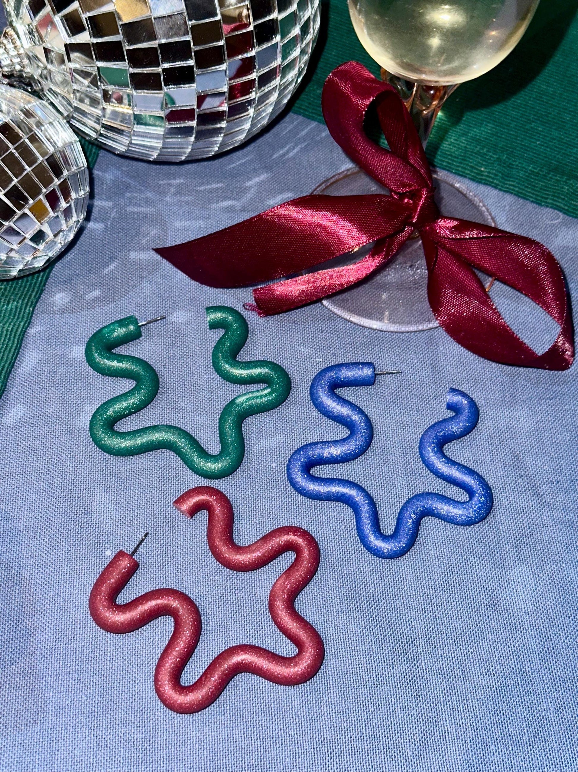 Turn up the glamour this festive season with the dazzling Sparkle Wiggle Hoops! These Christmas statement earrings are designed to shine at Christmas parties, festive dinners, and New Year’s Eve celebrations, as well as being a transitional piece in summer for all your festival looks! Handcrafted from polymer clay with imbedded glitter, they add a magical sparkle to every outfit. Chic and lightweight, these hoops are perfect for dancing the night away or sipping cocktails in style!